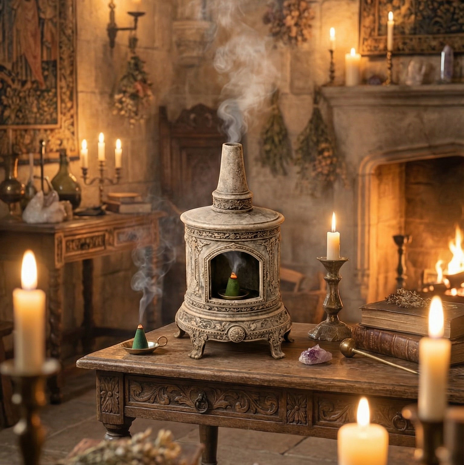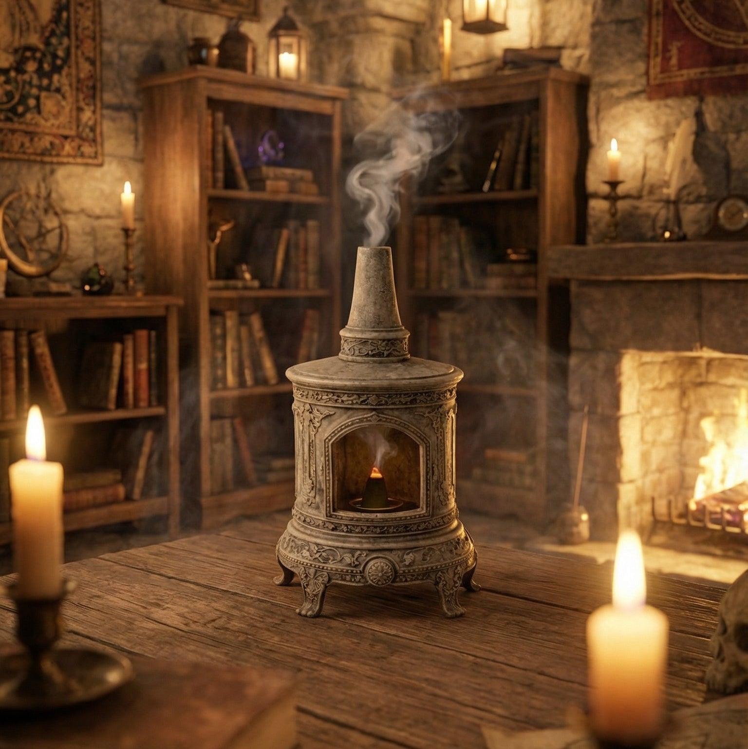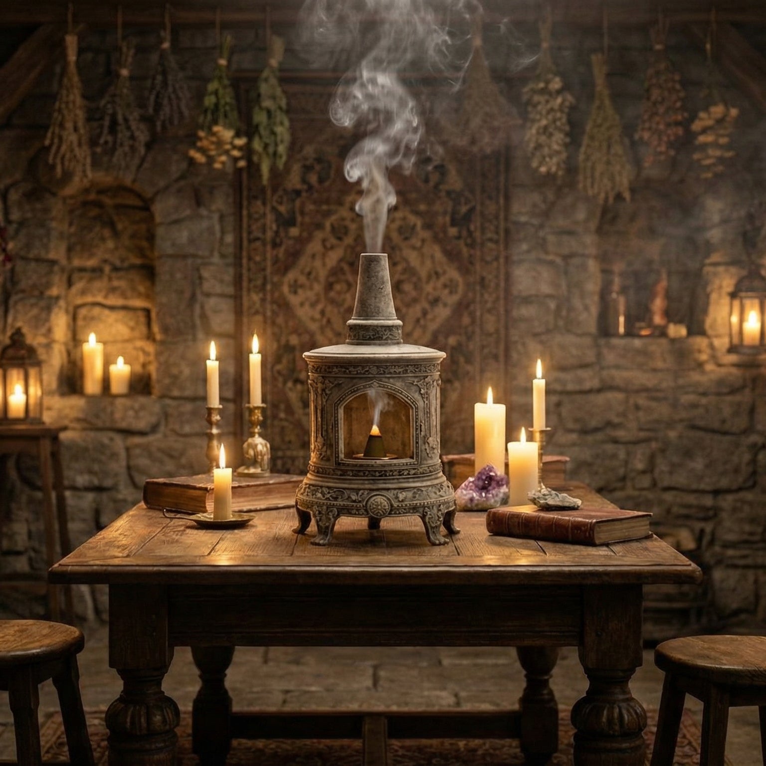 Kadim taş mimarisinden ilham alan detaylı işlemeleri, nostaljik soba formu ve geri akışlı duman efektiyle her kullanışta görsel bir şölen sunar.