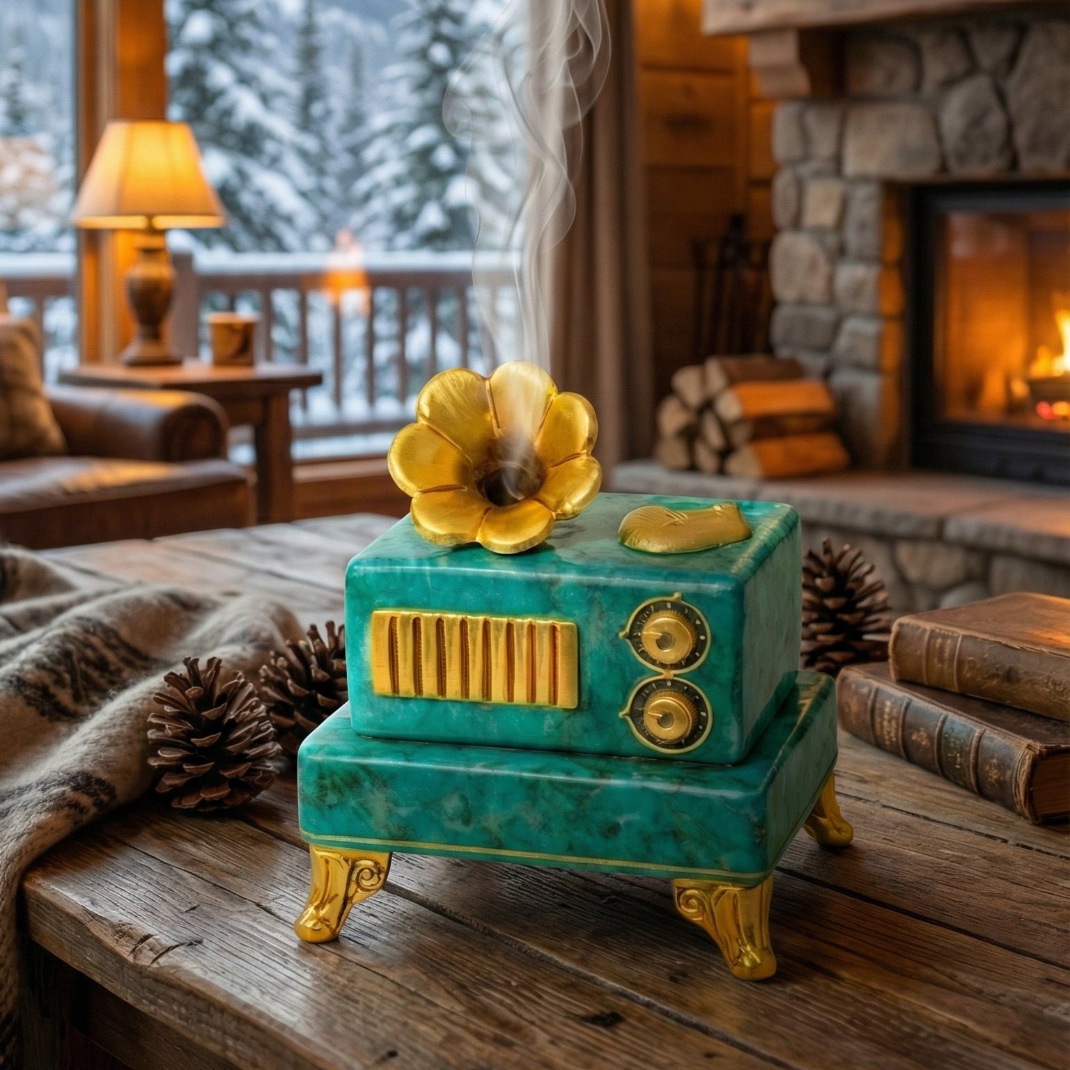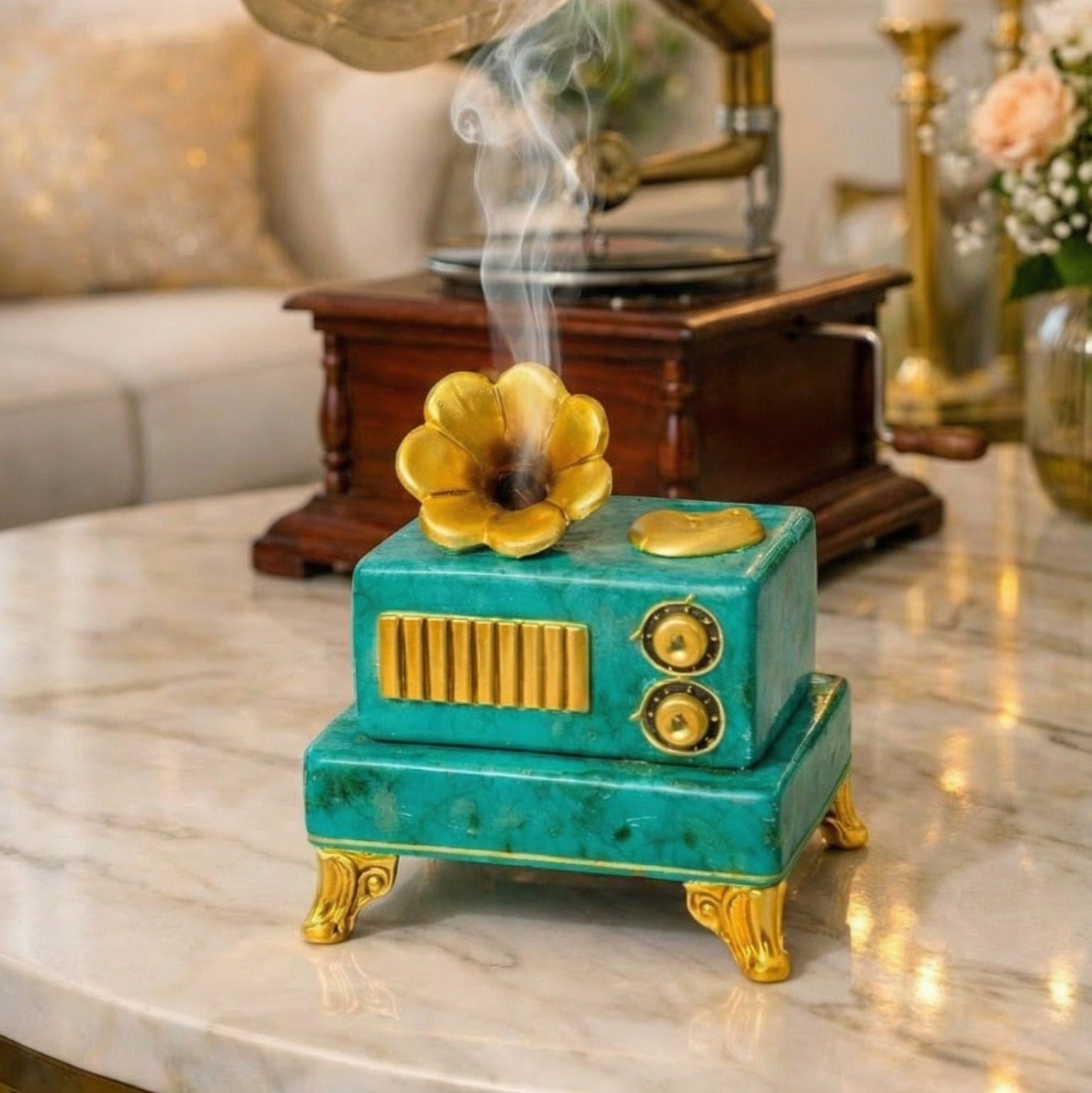 Eski zamanların zarafetini taşıyan bu özel tasarım; eskitme yeşil rengi, varaklı gold detayları ve nostaljik radyo formuyla dekorasyonunuzun baş köşesine yerleşmeye aday. Gramofon çiçeğinden süzülen tütsü dumanı, adeta görsel bir müzik şöleni sunarak ruhunuzu dinlendirir.