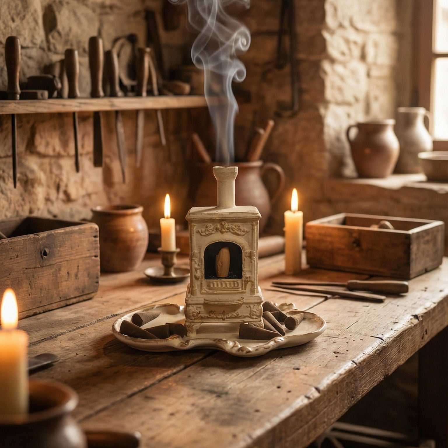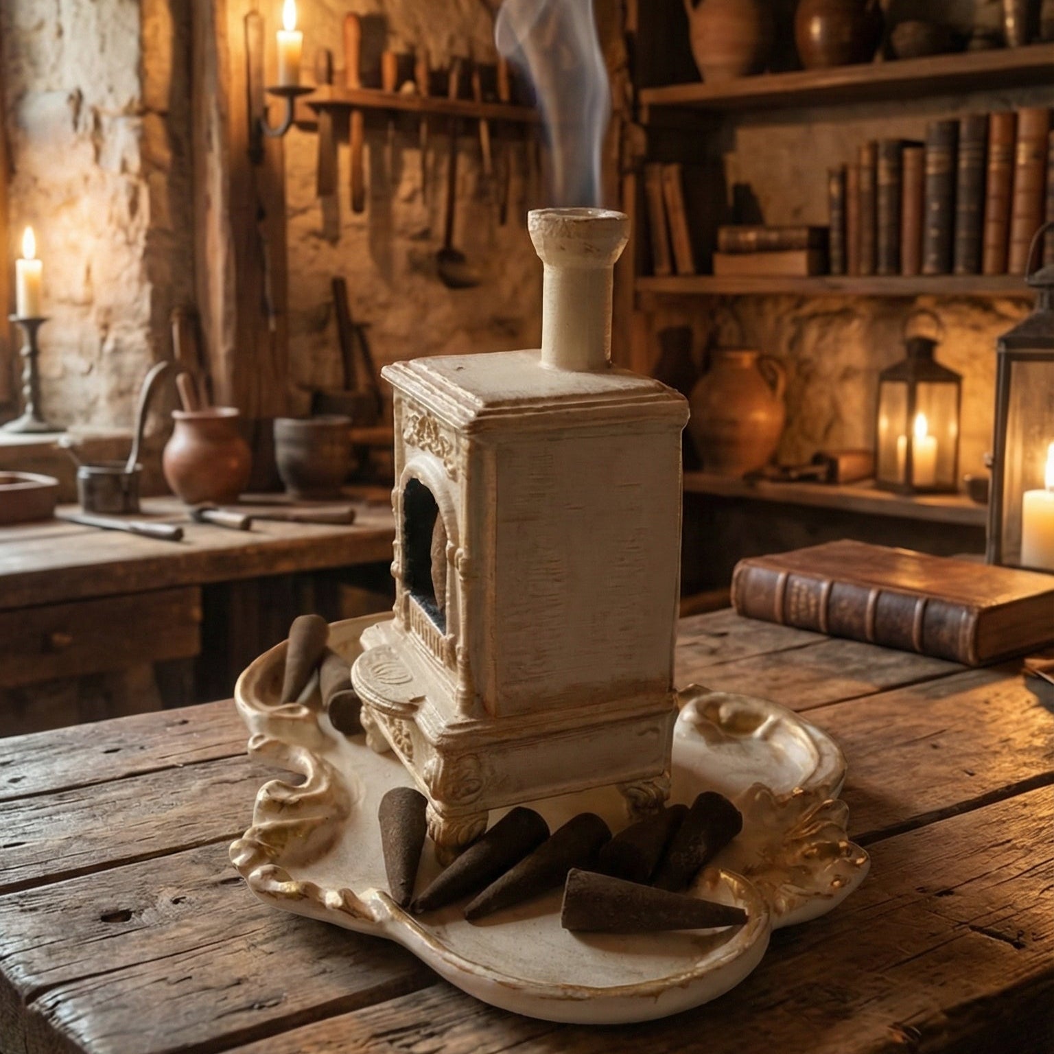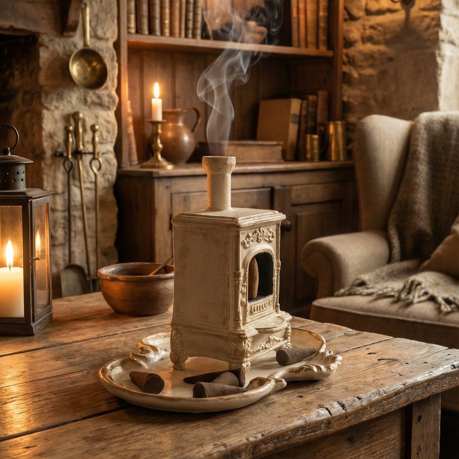 Eskitme taş görünümü, vintage detayları ve bacasından süzülen tütsü dumanıyla bu tasarım, modern evlere yaşanmışlık ve ruh katmak için tasarlandı. Tütsünüzü yaktığınızda bacadan usulca yükselen duman, odanızda büyüleyici bir atmosfer yaratır.